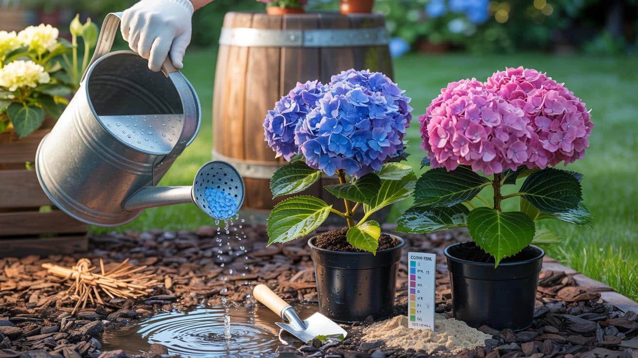 Regenwasser säuert tendenziell an und begünstigt Blautöne. Hartes Leitungswasser enthält viel Calciumcarbonat, das das Substrat über Wochen anhebt. Ammoniumhaltige Dünger (z. B. Ammoniumsulfat) senken den pH-Wert, kalkhaltige Gaben oder Gartenkalk heben ihn an. Organische Materialien wie Nadelstreu, Rindenmulch oder Heidelbeererde unterstützen eine moderate Ansäuerung.