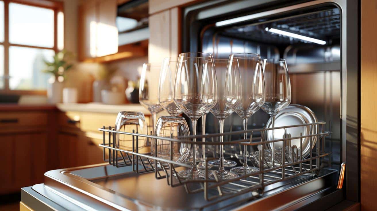 Stell deine Gläser in der Spülmaschine immer leicht schräg, mit freier Wasserablaufkante, und kombiniere das mit einem Glas-schonenden Programm plus zusätzlichem Klarspüler.