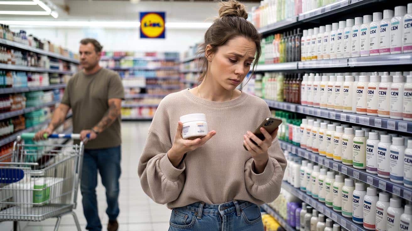 The woman in front of me at Lidl doesn’t look like a beauty influencer. Faded jeans, messy bun, shopping list on a crumpled Post-it. Yet she pauses for a full minute in front of the Cien shelf, phone in hand, zooming in on the tiny letters on the back of a face cream.