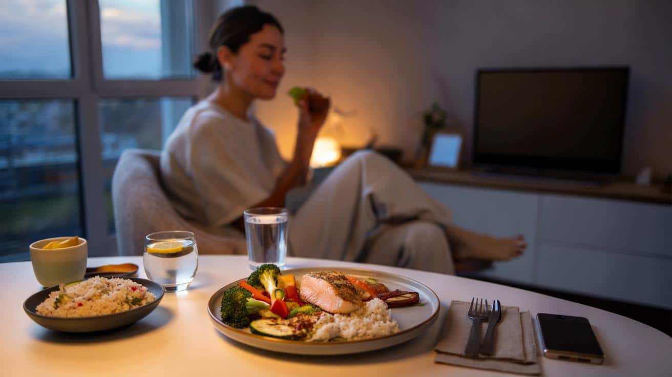 Adjusting dinner isn’t just about what’s on the plate. It’s also about the atmosphere around it. Eating in five minutes in front of a screen, barely chewing, tells your body you’re still in fight mode. Putting the phone aside, sitting down, taking ten slow breaths before you start, chewing properly, sends a different signal: the day is closing.
