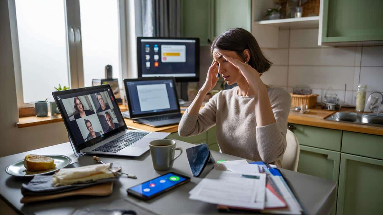 9:23 Uhr im Zoom-Meeting. Kamera an, Mikro stumm, Slack ploppt im Hintergrund im Sekundentakt. Auf dem Küchentisch liegt noch das Frühstücksgeschirr, rechts neben dem Laptop eine halbvolle Kaffeetasse, links ein Stapel ungeöffneter Briefe. Dein Chef redet über Deadlines, dein Kollege präsentiert Folien – und du liest gleichzeitig eine Mail, tippst im Chat und denkst nebenbei daran, dass die Waschmaschine seit 30 Minuten fertig ist.