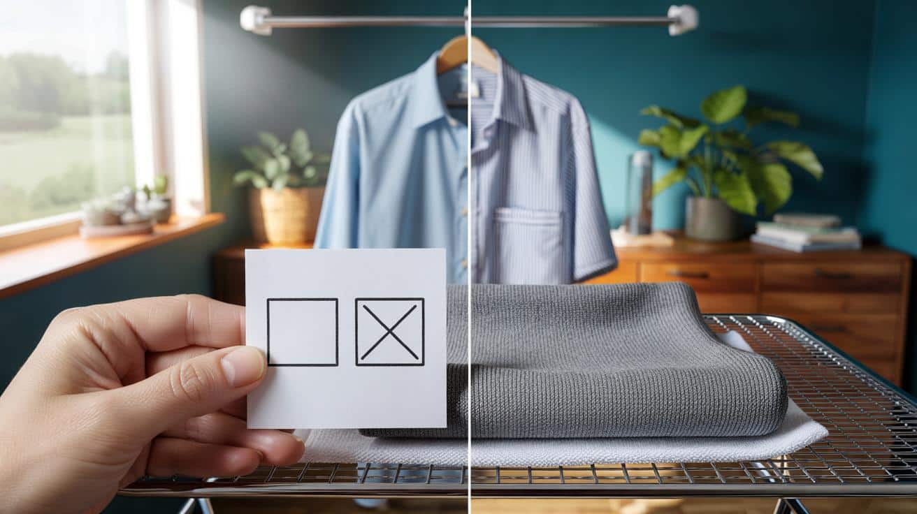 Nicht verwechseln: Der Trockner hat ein eigenes Zeichen, nämlich einen Kreis im Quadrat. Das ist eine andere Baustelle: Trommel, Temperaturpunkte, Schonprogramme. Beim reinen Quadrat geht es um Schwerkraft, Luftzirkulation und Formstabilität – ganz ohne Strom.