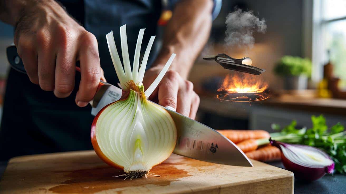 Die Logik dahinter ist simpel: Beim Zwiebelnschneiden bricht man Zellen auf, Enzyme treffen auf schwefelhaltige Vorstufen, daraus entsteht ein Reizstoff, der Richtung Augen aufsteigt. Im Bereich der Wurzel sitzen besonders viele dieser Vorstufen, das ist der „Hotspot“. Lässt man die Wurzel beim Schneiden als Anker dran, bleiben viele Zellen dort unberührt, der Reizstoff verteilt sich deutlich weniger. Kälte verlangsamt das ganze Spiel, eine scharfe Klinge zertrennt sauber statt zu zerquetschen, und ein leichter Luftzug trägt das, was trotzdem entsteht, weg. Seien wir ehrlich: Das macht eigentlich niemand jeden Tag – die Skibrille aufsetzen oder unter Wasser schneiden.