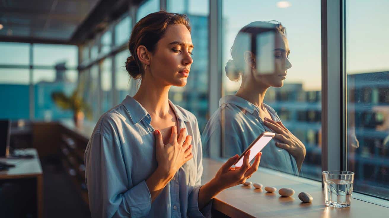 - Körper-Anker: Hand auf Brust, langsamer Ausatem, Blick heben