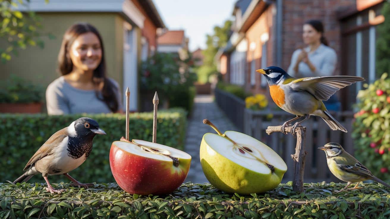 Die Methode ist schlicht: morgens eine halbe Birne und einen halben Apfel anbieten, am besten auf Brusthöhe der Vögel. Steck die Hälften auf einen dünnen Ast oder Spieß, 1,2 bis 1,8 Meter hoch, mit kleinem Abstand zur Hecke. Wechsle den Standort jeden zweiten Tag und nimm die Reste vor der Dämmerung wieder rein. Das duftet, ist sichtbar – und bleibt sauber.