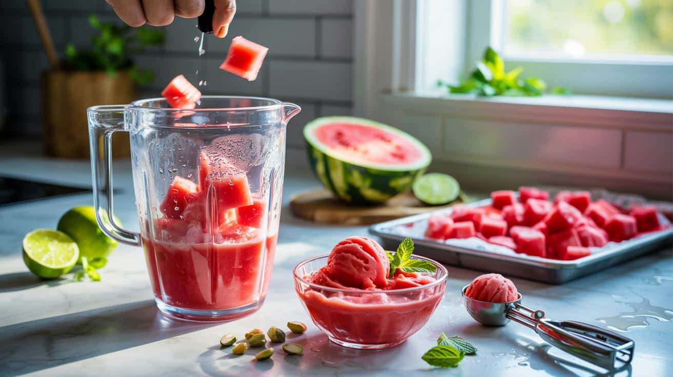 Grundformel: 400 g gefrorene Wassermelone + 1 Spritzer Säure + 30 Sekunden Pulsieren = 2 Portionen Sorbet.