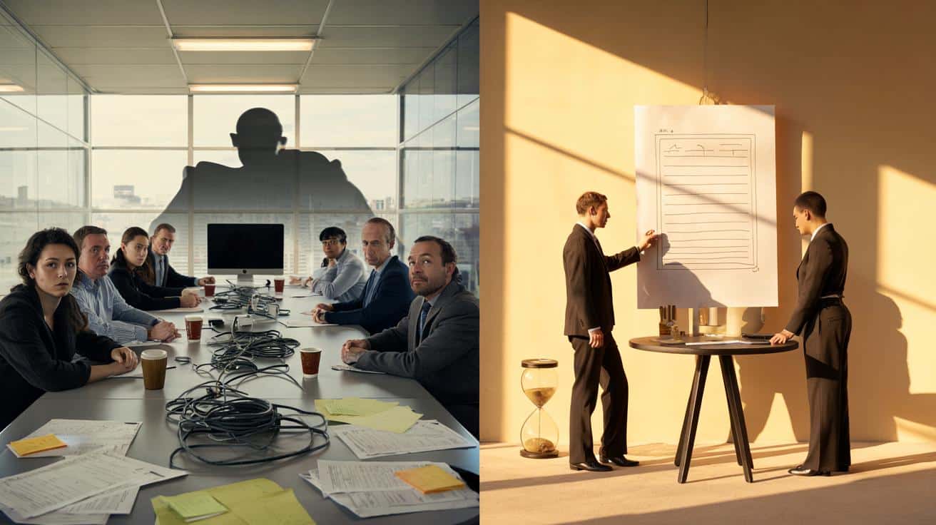 Zwölf Menschen sitzen in einem Raum, drei sind per Video zugeschaltet, eine Kamera starrt in eine müde Runde. Der Projektleiter räuspert sich, man klickt durch Folien, der Kaffee wird kalt. Eine brillante Idee blitzt auf, sie verglüht zwischen “Können wir das parken?” und “Wir sind schon über der Zeit”.Als die Stunde rum ist, sind alle informiert, aber niemand ist wirklich entschieden. Draußen blinzelt das Tageslicht, drinnen plant man den nächsten Termin. Wir alle kennen diesen Moment, in dem der Kalender lauter ist als die Arbeit. Und doch sagen alle zu.Heute passiert etwas Anderes.