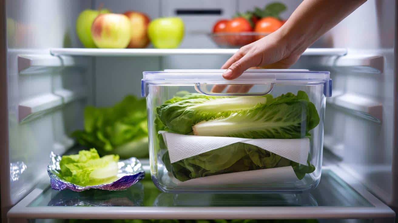 Halte Salat fern von Ethylen-Produzenten und nutze das Gemüsefach mit hoher Luftfeuchte.