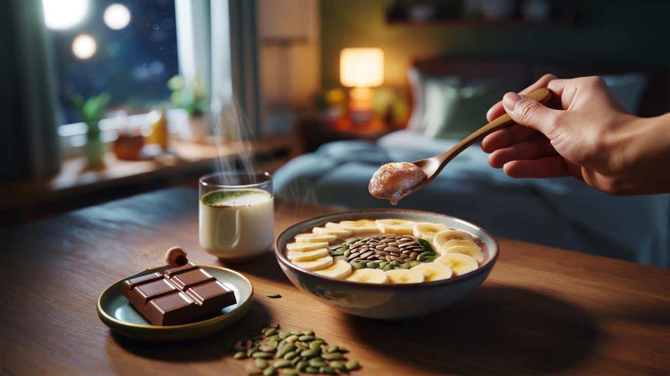 Klingt abstrakt, wird konkret mit Lebensmitteln: 40 g Haferflocken (≈70–80 mg Tryptophan, ≈50 mg Mg), 30 g Kürbiskerne (≈150–160 mg Tryptophan, ≈80 mg Mg), 150 g Skyr oder Joghurt (≈70–100 mg Tryptophan), 1 kleine Banane (≈10–15 mg Tryptophan, ≈30 mg Mg), 20 g Zartbitterschokolade 70 % (≈10–20 mg Tryptophan, ≈40–50 mg Mg). Zusammen ergeben sich etwa 320–380 mg Tryptophan und 200–230 mg Magnesium – plus 25–35 g Kohlenhydrate, die die Aufnahme von Tryptophan ins Gehirn erleichtern.