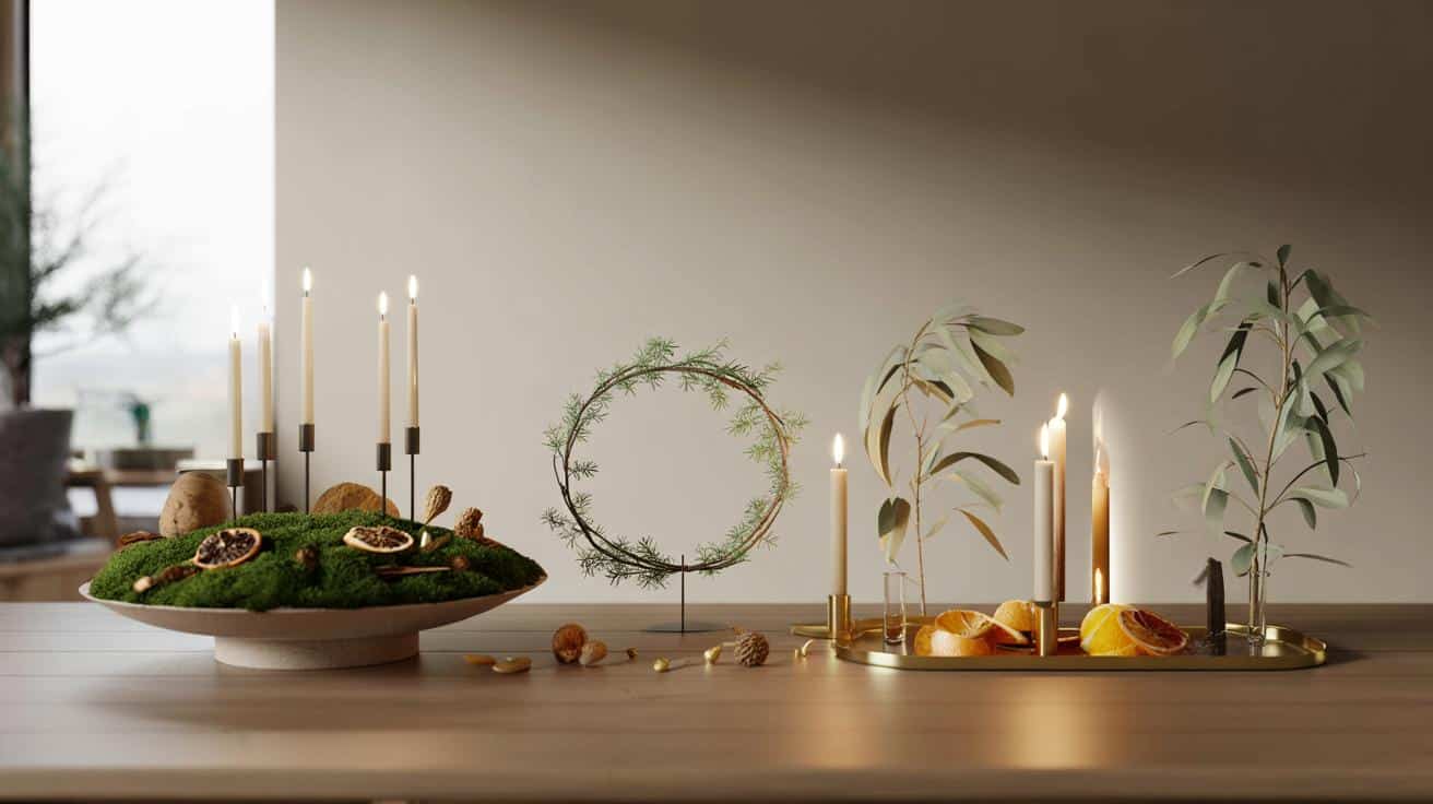 Tannengrün trocknet in beheizten Räumen schnell aus und verliert Nadeln. Alternative Materialien bleiben formstabil, sind gut kombinierbar und oft wiederverwendbar. Moos hält die Farbe, Eukalyptus trocknet gleichmäßig, Olivenzweige wirken ruhig, Zitrus bringt Frische ins Bild. Auch Sukkulenten, Trockenblumen oder Beerenzweige liefern Struktur ohne Pflegeaufwand.