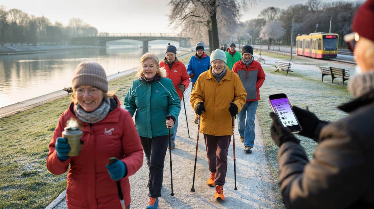 Jemand klappt die Stöcke aus, jemand anderes winkt der Linie 4, die gerade an der Haltestelle ausrollt. Es ist Winter 2025, kurz nach neun, und die Stadt klingt leiser als im Sommer. Eine Hand tippt eine Nachricht in die Gruppe: „Heute flache Route, leichter Frost, sonnig.“ Eine andere Hand hält ein Thermobecherchen, das nach Ingwer riecht. Zwei Nachbarinnen, die sich seit Jahren kennen, gehen los, als hätte jemand eine verborgene Uhr gestartet. Man spürt dieses Winterlicht wie eine Erinnerung, die wieder auftaucht. Der Asphalt glitzert, die Schritte finden einen gemeinsamen Takt. Ein Lachen platzt in die Kälte und bleibt kurz hängen, wie eine Fahne. Und dann passiert etwas, das man schwer allein herstellt.