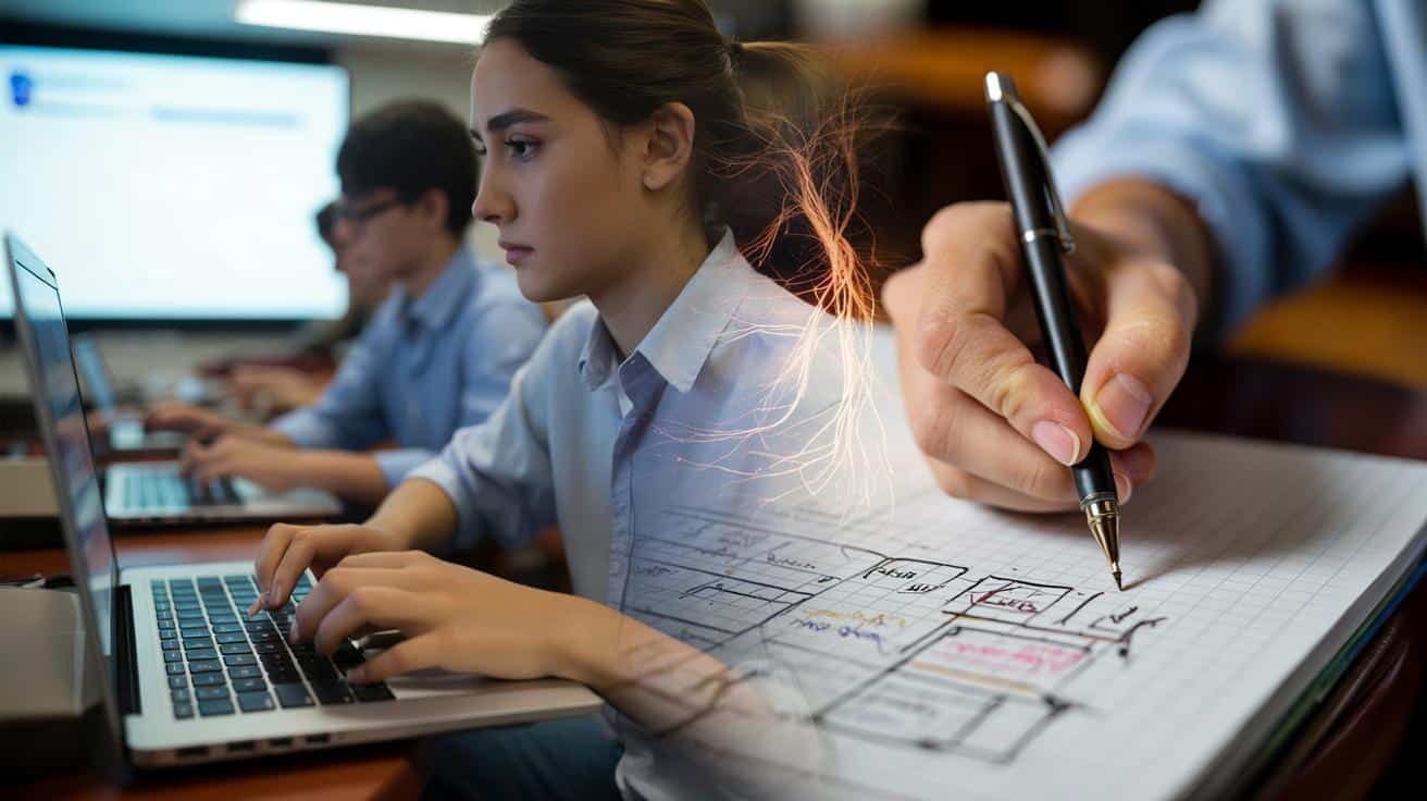 Vorne klickt eine Präsentation weiter, und in Reihe drei schiebt ein Student die Finger über sein Trackpad, als wollte er hinter dem Inhalt herjagen. Zwei Plätze daneben blättert eine junge Frau in einem karierten Notizbuch, der Stift schrammt leicht, stockt, setzt an, kreist ein Wort. Ich sehe, wie sie die Überschrift doppelt unterstreicht, ein kleines Blitzsymbol daneben, als Erinnerung. Nach der Stunde schauen beide auf ihre Notizen: eine Textwand auf dem Bildschirm, ein Geflecht aus Pfeilen, Kästchen, drei Fragen am Rand auf Papier. Eine Woche später, kleiner Test. Unterschiedlich lange Gesichter. Und ein Detail, das hängen bleibt.