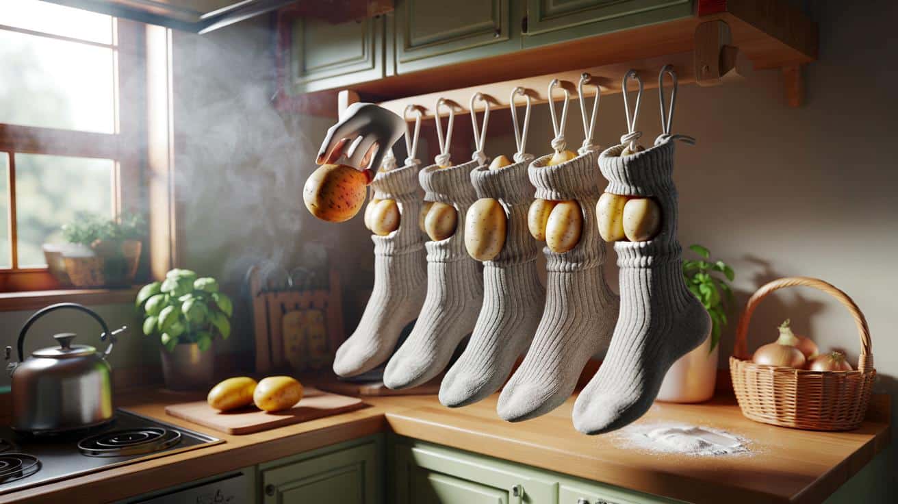 Manchmal braucht es kein neues Regal, sondern eine Socke. Kleine Küchen kämpfen mit großen Vorräten, und irgendwo zwischen Zwiebeln, Töpfen und Gewürzgläsern fangen Kartoffeln an zu keimen. Der Platz geht schneller aus als der Hunger.