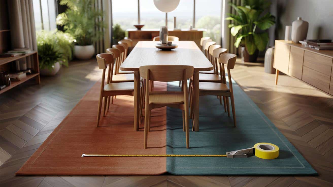 Die Mathematik liefert die Basis, die Feinheit kommt mit dem Raum. Ein schmaler Raum profitiert von einem Teppich, der die Tischform aufnimmt und an den Längsseiten mehr Luft lässt. In offenen Grundrissen hilft ein breiterer Teppich, die Esszone zu „erden“. Der Trick ist Balance: Genug Teppich, damit Stühle sicher stehen, genug Boden, damit der Raum nicht zupackt.