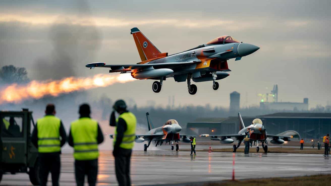 On a grey November morning in Manching, the fog hangs low over the runway and the sound hits you before the scene comes into focus. A deep metallic growl, then a tearing roar as a Eurofighter Typhoon claws into the Bavarian sky, afterburners burning like twin suns in the mist. Technicians in fluorescent vests pause mid-gesture, watching their work take shape, while a group of visiting officers murmur quietly at the edge of the tarmac. Everyone knows this isn’t just another test flight.