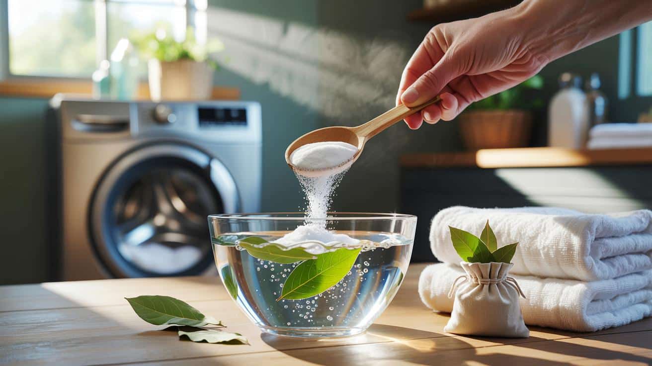 Wer weniger Zeit hat, nutzt den Effekt im Waschgang. Ein kleiner Beutel aus Stoff mit 3–5 Lorbeerblättern kommt in die Trommel. 1–2 Esslöffel Natron direkt zum Waschmittel geben. Das verbessert den Geruch und kann Reinigungsleistung bei hartem Wasser stabilisieren.