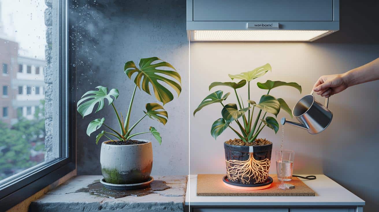 Der Trick ist simpel: Halte die Wurzelzone konstant warm und gib dem Blatt verlässlich viel Licht. Hebe den Topf vom kalten Untergrund, zum Beispiel mit Kork, Holz oder einem Bücherstapel. Nutze lauwarmes Gießwasser um 22–25 °C und erhöhe den Lichttag auf 12–14 Stunden mit einer neutralweißen LED (4.000–6.500 K), Zielbereich 5.000–10.000 Lux. Optional: eine kleine Heizmatte auf 20–24 °C, nicht heißer. Einmal pro Woche ein feiner Blattdünger-Nebel (0,2 %), morgens, dann Luftzirkulation. Das ist der Warmwurzel-Trick.