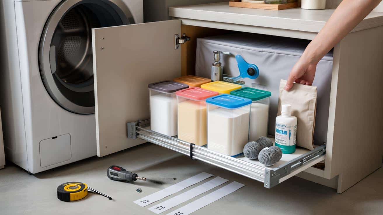 Ein Griff, und es rieselte wieder Waschpulver über die Kante. Ich beobachtete, wie eine Nachbarin die Schranktür links vom Trockner öffnete, zwei flache Schienen herauszog und – zack – stand das ganze Waschpulver-Set vor ihr, sortiert wie in einer Ladenkasse. Keine Verrenkung, kein Streuverlust. Wir kennen alle diesen Moment, in dem man denkt: Hier müsste es doch eine einfache Lösung geben. Der Organizer klickte leise ein, verschwand, und die Fläche war plötzlich frei. Ich hatte nicht erwartet, dass ein Stück Metall so viel Ruhe in einen Raum bringen kann. Ein kleiner Zug, großer Effekt. Und dann fiel mir etwas auf.