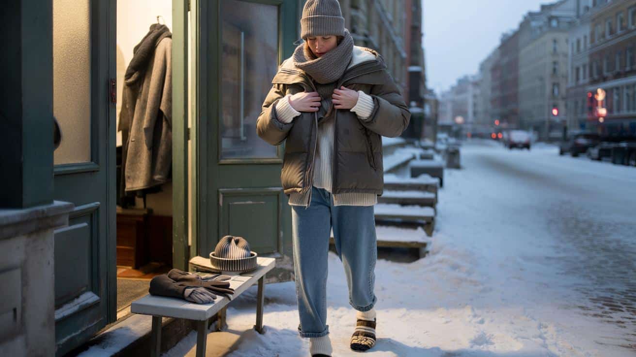 Dann kommen Socken, erst eine dünne Schicht, dann die dickeren. Danach ziehst du die Hose an – ruhig so, dass unten noch Platz für warme Luft bleibt, nicht hauteng gestriggt. Oberkörper: Jetzt erst Pullover oder Hoodie, den du kurz glattziehst, damit nichts verrutscht oder faltig klemmt. Schuhe erst ganz am Ende, wenn du wirklich kurz vor der Tür stehst. So hält die angestaute Wärme länger und deine Füße gehen nicht „kalt“ in den Schuh. Schal, Mütze, Handschuhe legst du dir griffbereit an die Tür, statt sie zwischendurch schon anzuziehen und wieder auszuziehen.
