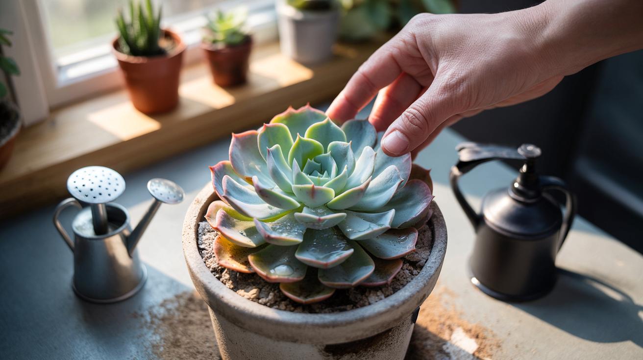 Wir alle kennen diesen Moment, in dem man das Sprühteil zur Hand nimmt, weil die Blätter staubig aussehen. Ein Freund sprühte seine Echeveria jeden zweiten Tag, weil sie „Wüstensonne und Tau“ bekommen sollte. Drei Wochen später: Außen noch blaugrün, innen schwarzbraun. Die Mitte löste sich beim Anfassen wie ein nasser Keks. Kein Drama davor, kein gelbes Warnblatt – einfach von innen heraus weg. Die Oberfläche war trocken, das Herz war nass. Das trügerische Gefühl „oben trocken, also gießen“ führt beim Rosetten-Typ direkt in die Falle.