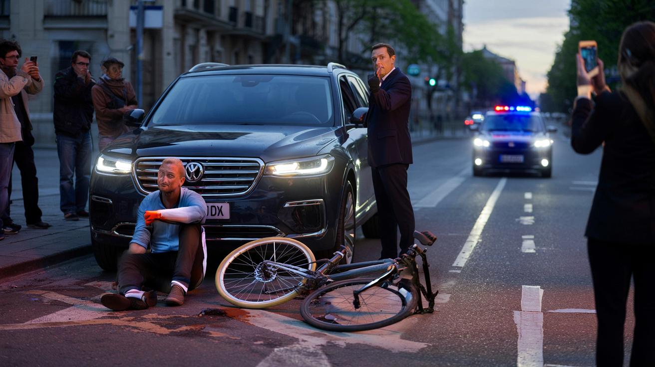 Kein lauter Knall, eher ein schnappendes Geräusch, so als würde jemand einen dicken Zweig brechen. Ein Radfahrer liegt wenige Sekunden später halb auf dem Radweg, halb auf der Fahrbahn, sein Vorderrad in einem surrealen Winkel verbogen. Neben ihm steht ein glänzender SUV, Motor noch an, Tagfahrlicht grell. Der Fahrer hebt abwehrend die Hände, die Nachbarn treten auf die Balkone, zwei Passanten zücken ihre Handys. Der Radfahrer blutet an der Hand, das Fahrrad ist Schrott, der SUV hat nur einen kleinen Kratzer im Kunststoff. Und dann kommt der Satz, der alles kippen lässt.