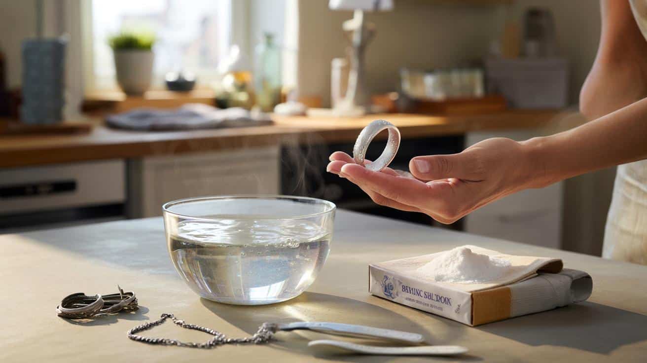 Auf den Punkt gebracht: Es geht um die Alufolie-Natron-Methode. Eine flache Schale mit Alufolie auslegen, die glänzende Seite nach oben. Ein bis zwei Teelöffel Natron oder Backpulver darüber streuen. Schmuck aus echtem Silber – ohne empfindliche Steine oder Perlen – darauf legen. Mit sehr heißem Wasser übergießen, bis alles bedeckt ist. Ein kurzer Moment Geduld, manchmal steigt ein leichter Geruch nach faulen Eiern auf, ein leises Knistern. Nach zwei bis fünf Minuten den Schmuck mit einem Löffel herausheben, unter klarem Wasser abspülen und mit einem weichen Tuch abtrocknen. *Mehr braucht es oft nicht, um Jahre von einem Ring zu nehmen.*