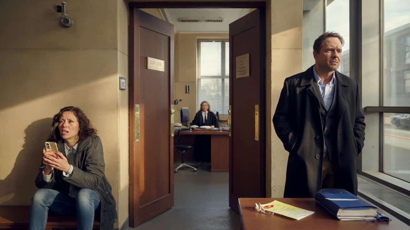 Vor Saal 214 sitzt eine Mutter auf dem Boden, die Jacke halb offen, die Hände zittern, das Smartphone leuchtet wie ein Fluchtweg in ihrer Hand. Einige Meter weiter starrt der Vater aus dem Fenster, Kiefer angespannt, beide Fäuste in den Taschen, als könnte er so verhindern, dass er gleich etwas sagt, das alles noch schlimmer macht. Drinnen, hinter der schweren Holztür, diktiert eine Familienrichterin ihr Urteil in ein Mikrofon – ruhig, sachlich, fast steril. Draußen rutscht jemand im Stuhl nach vorne, eine Träne, ein Fluch, ein dumpfer Schlag gegen die Wand. Sekunden später liegt ein Zettel auf dem Tisch des Richters: „Sie werden das noch bereuen.“