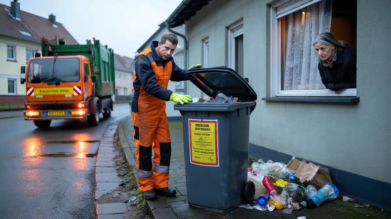 Ein städtischer Mitarbeiter hebt den Deckel einer grauen Tonne, beugt sich hinein, zieht eine halbvolle Plastikflasche aus einem zerknüllten Restemüllsack. Der Atem steht sichtbar in der kalten Luft, die Straße ist noch halb leer, nur eine ältere Nachbarin beobachtet alles hinter der Gardine. Ein gelber Aufkleber landet auf der Tonne: „Fehlwurf – wird nicht geleert“. Der Müllwagen fährt weiter. Die Tonne bleibt stehen. Und mit ihr die Frage: Soll das jetzt Erziehung sein oder bloße Bloßstellung?