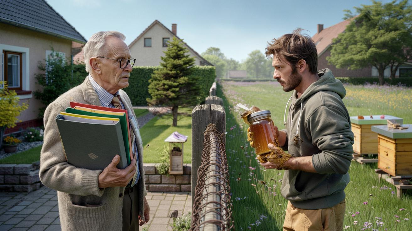Horst B., 72, Ex-Buchhalter, zieht seinen Ordner aus grauem Karton aus der Tasche wie früher im Büro seine Akten. Jede Seite markiert, jede Zahl unterstrichen. Ihm gegenüber steht Imker Leon, 39, Kapuzenpulli, Gummistiefel, die Hände noch klebrig vom Honigschleudern. Für Horst ist es eine einfache Rechnung: „Sie verdienen doch hier Geld, junger Mann. Und ich soll meine Rente versteuern?“ Seine Stimme kippt leicht nach oben, eine Mischung aus Empörung und Verletzung. Für Leon ist dieser Garten sein Rückzugsort, kein Betriebsgelände. Zwei Biografien treffen sich an einer Grundstücksgrenze, und plötzlich geht es nicht mehr nur um Bienen.
