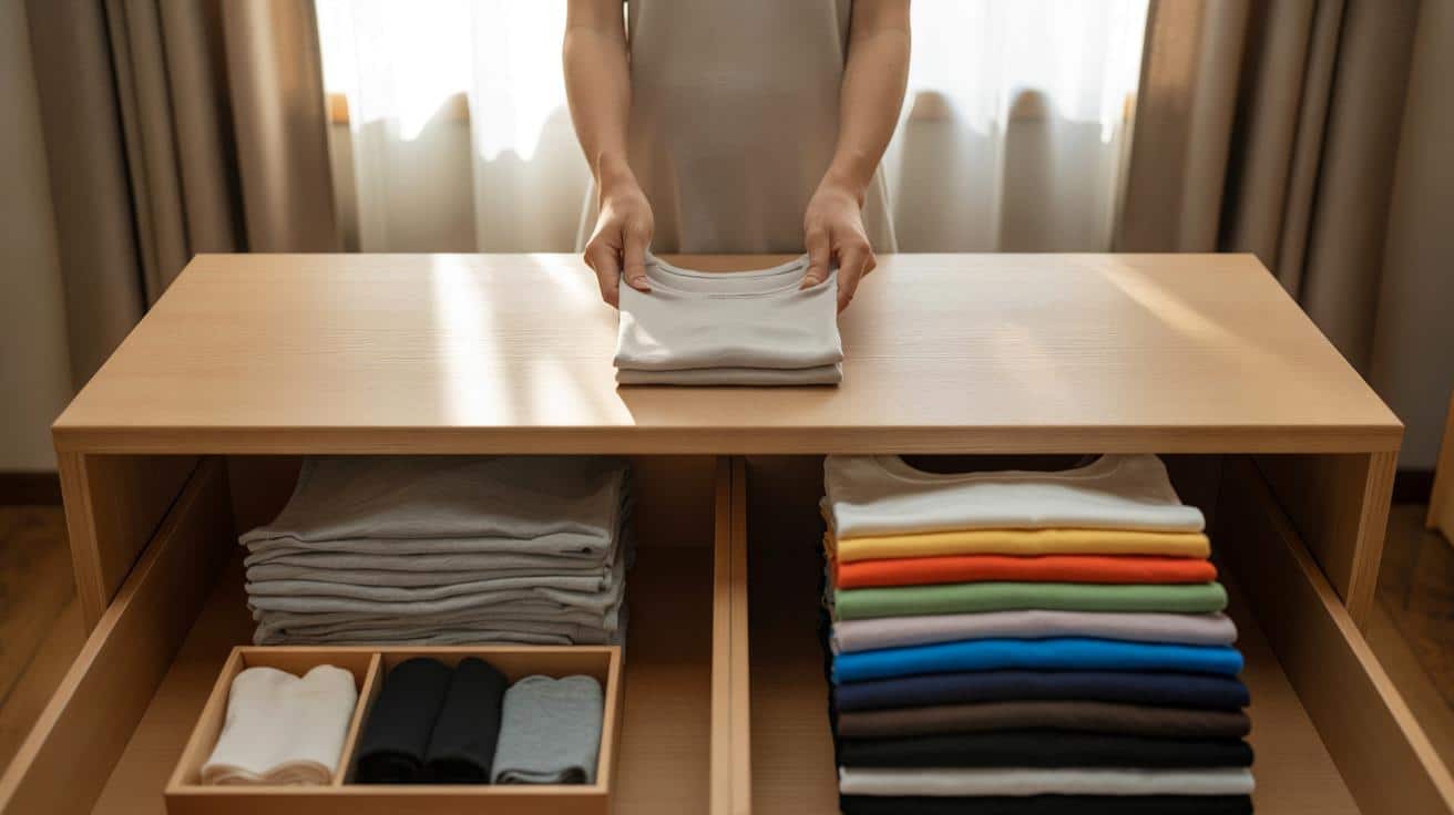 | Vertikales Falten | T‑Shirts stehen aufrecht und bleiben sichtbar | Schneller greifen, weniger Unordnung |