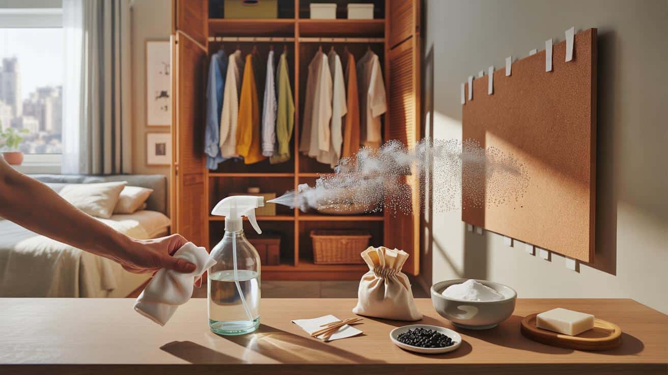 Erst aufräumen, dann reinigen. Staub absaugen. Anschließend ein Tuch mit einer Mischung aus Wasser und farblosem Haushaltsessig (1:1) befeuchten und alle Flächen wischen. Türen geöffnet lassen, bis alles trocken ist. Essig neutralisiert Gerüche und verändert das Milieu für Mikroorganismen.