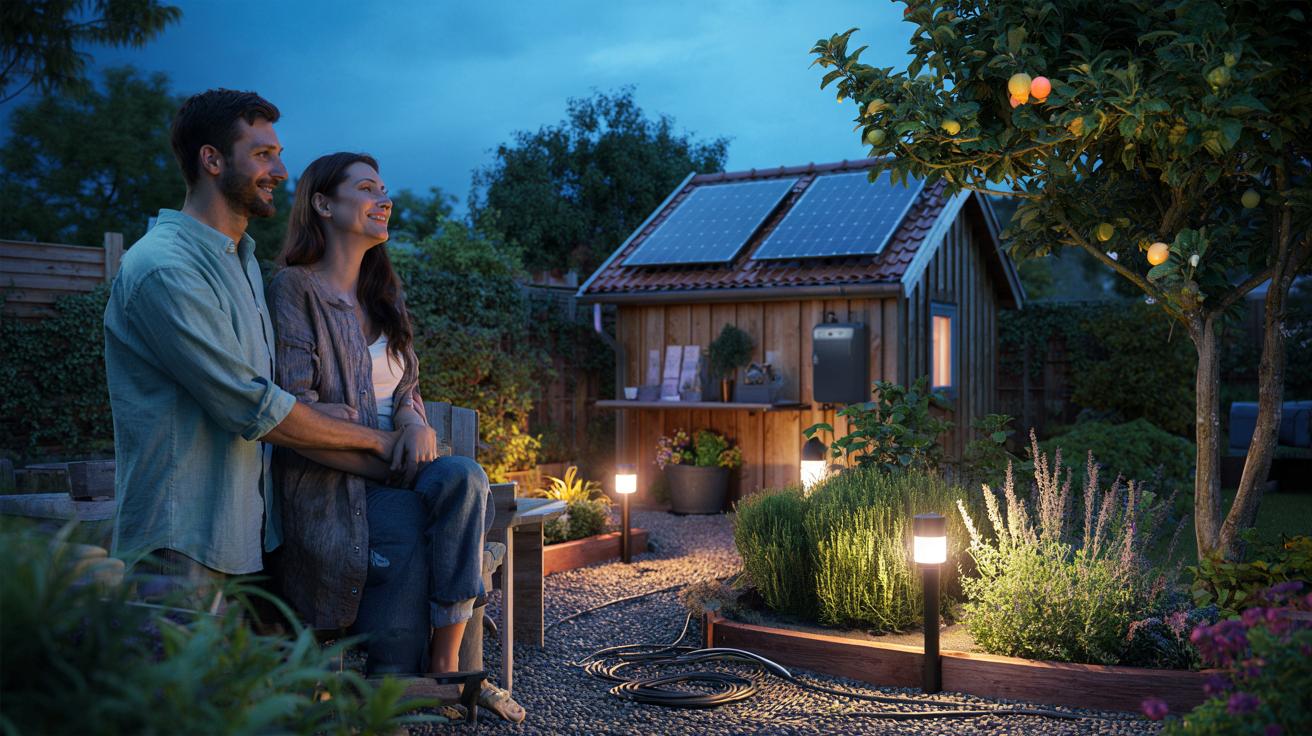 Die Luft riecht nach Schnittlauch und nassem Holz, als Maja den Schalter am Dämmerungssensor auslöst. Ein leiser Klick, dann erwachen die Spots am Kiesweg, ein warmes Band aus Licht legt sich um den Apfelbaum. Tom steht daneben, Hände in den Taschen, und schaut rüber zum Schuppen: Zwei matte Paneele auf dem Dach, ein kleiner Kasten darunter, Kabel sauber geführt. *Dieses leise Surren ist neu in ihrem Gartenleben.* Sie haben das Set an einem verregneten Samstag montiert, ohne Drama, mit Pausen für Kaffee und kurze Diskussionen über den besten Winkel. Jetzt laufen die LEDs über einen Akku, gespeist vom Tag. Und die Steckdosen bleiben unberührt. Was bringt das wirklich?