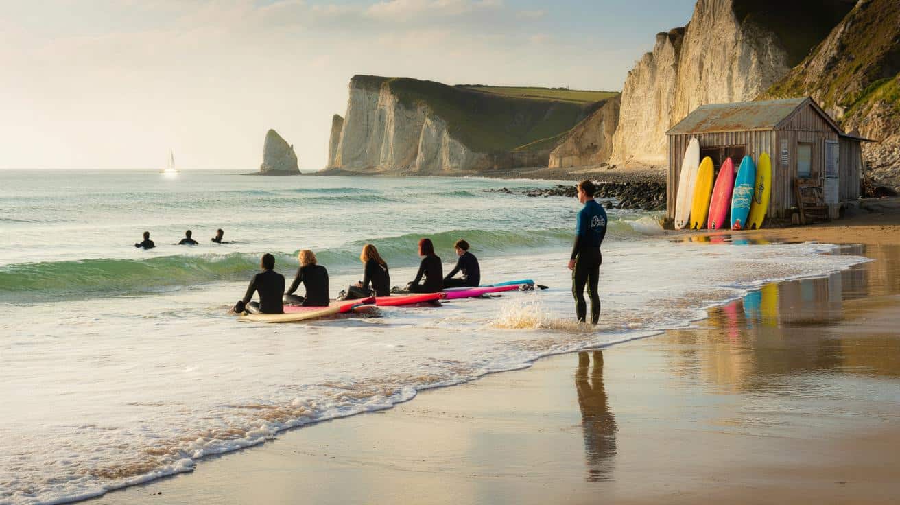 - Frage 1Wo genau liegt dieser Strand, der Maler und Surfer gleichermaßen anzieht?Er befindet sich an einem Abschnitt der normannischen Küste in Frankreich, der für seine hellen Kreidefelsen, das schnell wechselnde Licht und das ungewöhnlich klare, türkisfarbene Wasser bekannt ist.