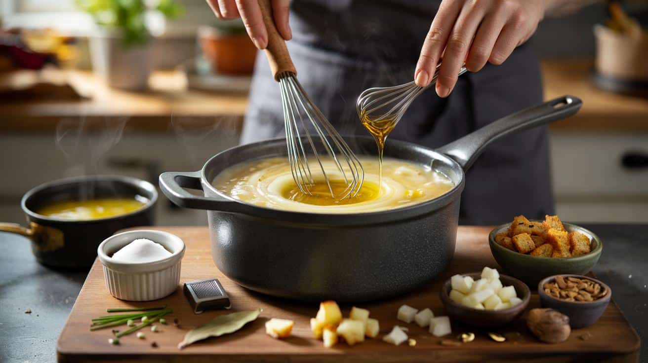 Diese kurze Attacke mit dem Schneebesen setzt gezielt Stärke frei, ohne die Struktur völlig zu zerstören. Es ist das Gegenteil von „länger mixen hilft“ – das macht die Suppe oft klebrig. Gib am Ende ein wenig Fett in feinem Strahl dazu, während du rührst, wie beim Mayonnaise-Schlagen. So verbindet sich die freigesetzte Stärke mit dem Fett zu dieser Seidigkeit, die man sonst Sahne zuschreibt. Wer hier geduldig rührt, wird belohnt.