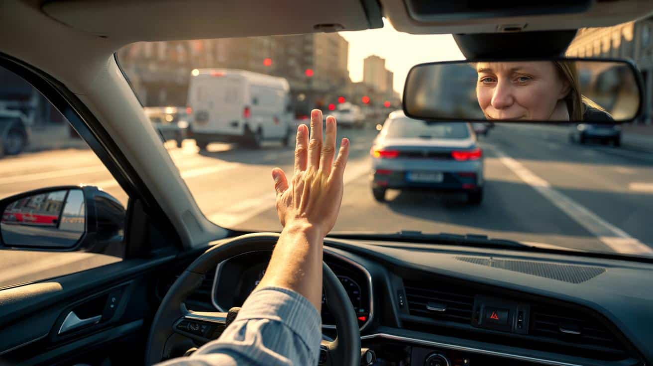 Die Methode ist simpel. Heb die offene Hand auf Brust- oder Fensterhöhe, Handfläche sichtbar, zwei Sekunden, nicht mehr. Blickkontakt über Rück- oder Seitenspiegel, ein kurzes Nicken. Kein großes Winken, keine theatralische Choreografie. Ein kurzer Blick, eine offene Hand – mehr braucht es oft nicht.