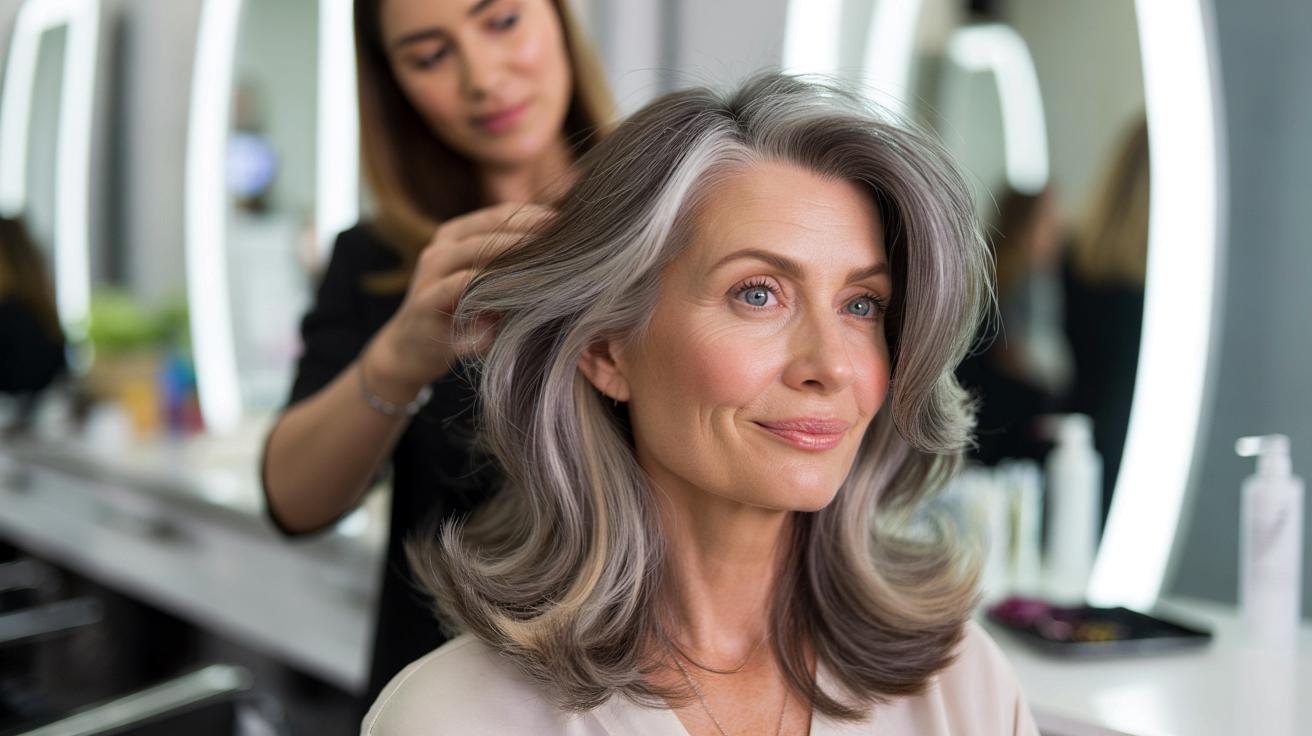 Nach einem Grey-Blending-Termin bleiben ihre grauen Strähnen sichtbar, vor allem an den Schläfen. Doch rund ums Gesicht laufen jetzt fein gesetzte, etwas hellere Töne, die das Grau weicher machen. Die Längen haben durch ein kühles Gloss mehr Glanz, der gelbliche Schleier ist verschwunden. Sie sagt: „Ich habe mein Grau behalten, aber die Müdigkeit abgegeben.“ Seien wir ehrlich: Genau diese Balance suchen viele – selbstbewusst, aber nicht älter markiert als nötig.