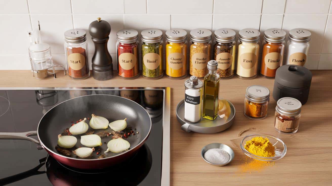Gewürze nach Alphabet sortieren klingt ordentlich, fühlt sich am Herd aber wie Gegenwind an. Intuitiv wird es, wenn du nach Kochmomenten ordnest: Start, Mitte, Finish. Start sind die Aromen für den ersten Kontakt mit dem heißen Fett, Mitte sind die Gewürze, die Volumen geben, Finish veredelt in Sekunden.