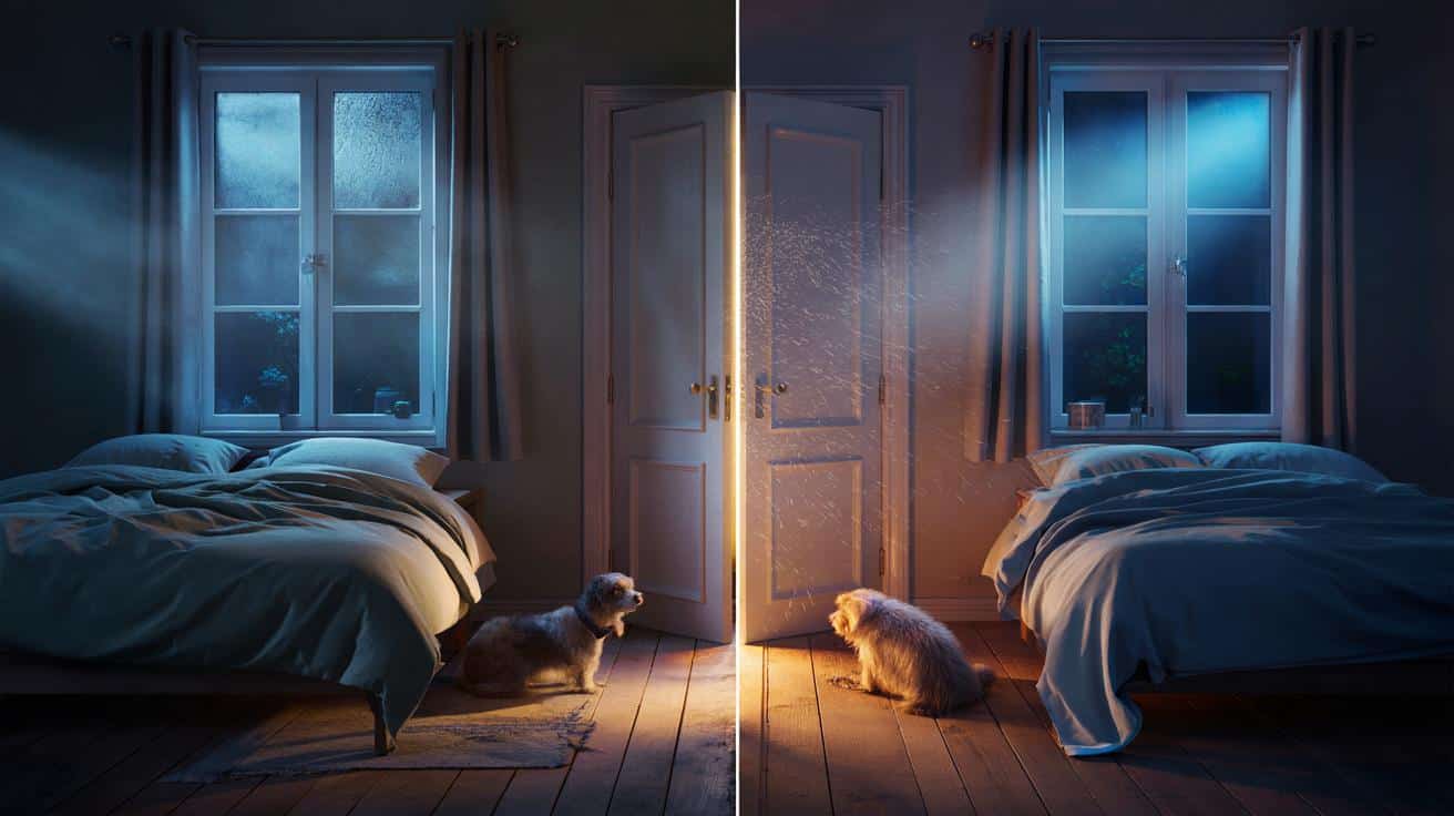 Die Luft fühlt sich dichter an, sobald das Klicken der Türklinke verstummt. Das Handy blinkt kurz, die Decke raschelt, draußen knackt die Heizung im Flur. Im Zimmer selbst bleibt nur der feine Rhythmus des Atems, zwei Menschen, ein Hund – und eine Tür, die dicht schließt wie ein Deckel. Man schläft darüber hinweg, bis der Wecker klingelt und die Stirn schwer ist. Was hat die Nacht mit der Luft gemacht?
