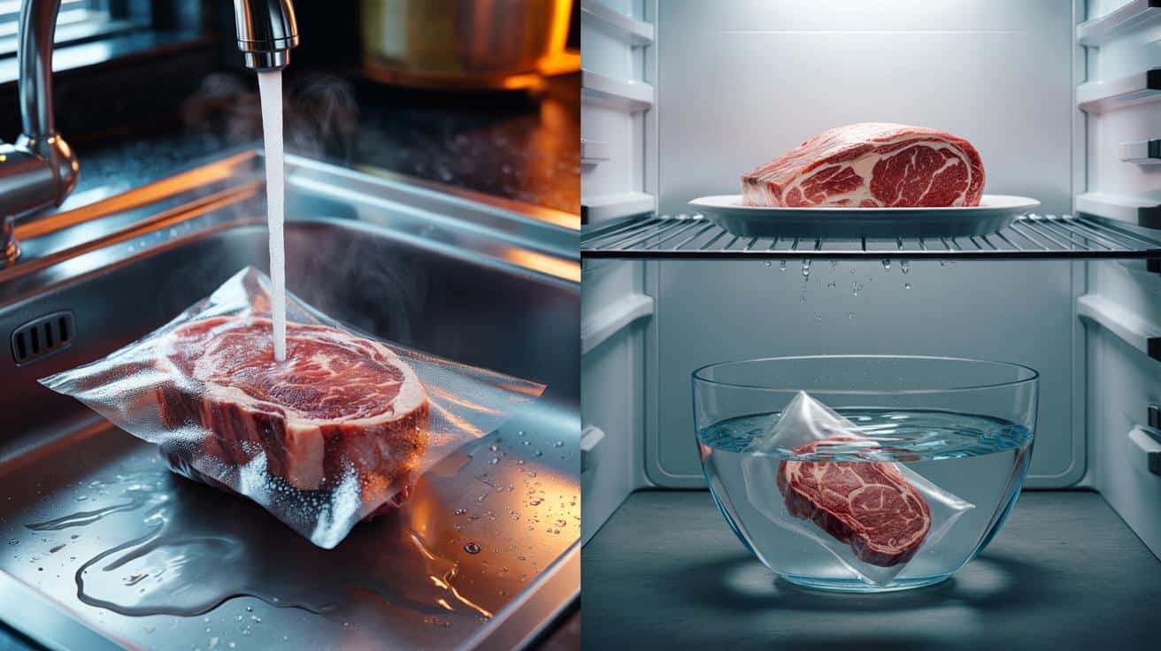 Ich habe es einmal als Experiment gemacht: zwei gleiche Steaks, eines im 45-Grad-Wasser für 15 Minuten „angetaut“, das andere über Nacht im Kühlschrank. Das Wasser-Steak roch neutral, wirkte aber nass und bekam in der Pfanne einen grauen Rand, bevor es überhaupt Farbe sah. Das Kühlschrank-Steak bräunte direkt, blieb saftig, hatte Biss. Zahlen dazu sind gnadenlos: Zwischen 10 und 40 Grad verdoppeln sich manche Keime alle 20 bis 30 Minuten.
