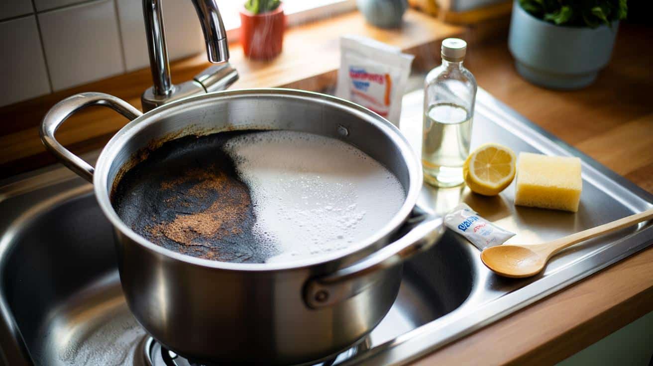 Im Kern geht es um Chemie und Temperatur. Angebrannte Essensreste bestehen aus verkohlten Zucker-, Fett- und Eiweißresten, die sich wie eine dünne Kruste mit dem Metall verbinden. Nur Wasser und Spüli sind dafür zu schwach. Erst wenn etwas hinzukommt, das diese Verbindung löst, wird es richtig spannend – und dann braucht es plötzlich nicht mehr viel Kraft. Seien wir ehrlich: Niemand hat Lust, eine halbe Stunde lang mit roter Hand über der Spüle zu stehen.