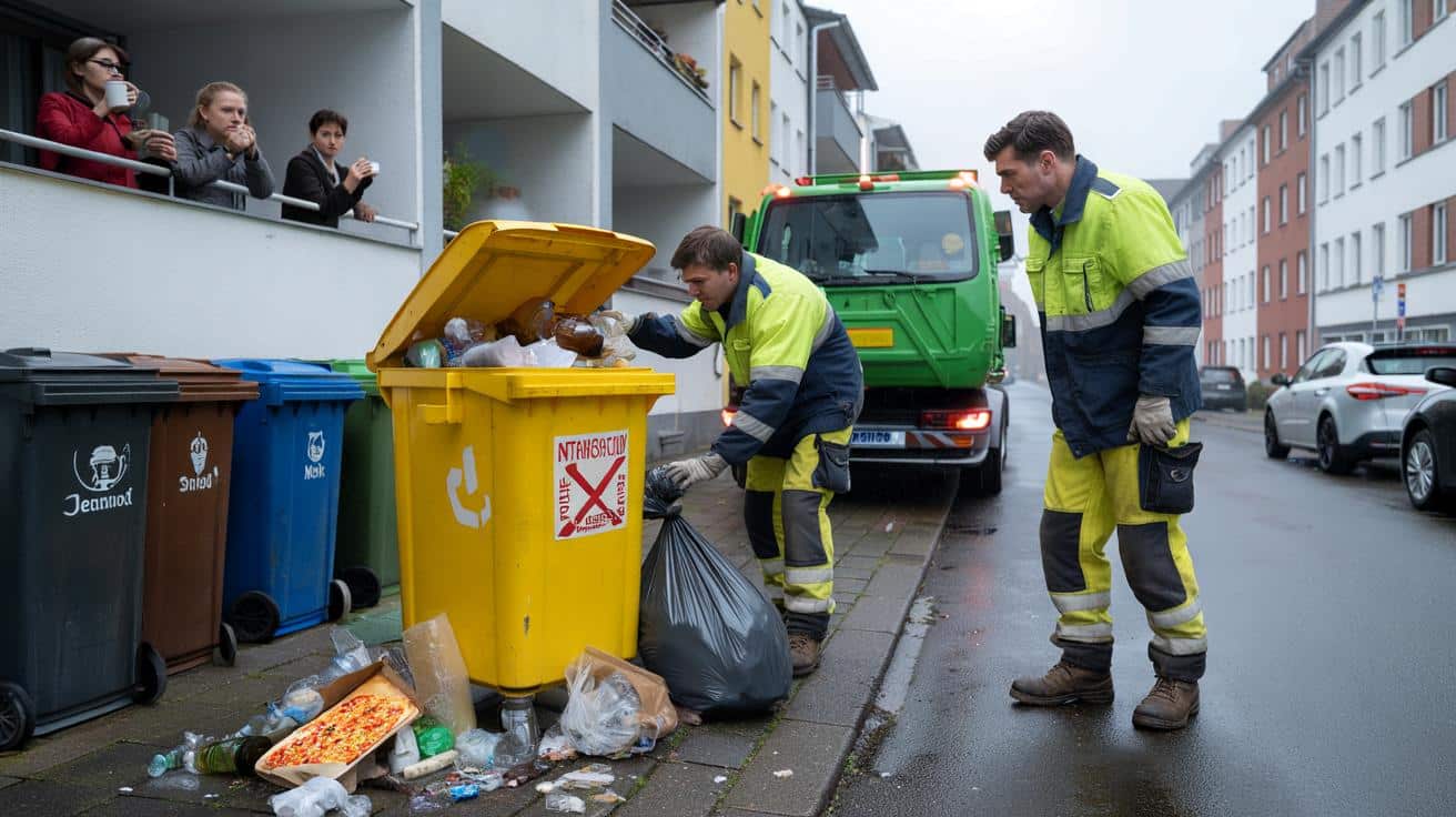 On a grey Tuesday morning in Dortmund, the garbage truck stops in front of a quiet apartment block. Two municipal workers climb down, lift the yellow recycling bin a little… and then do something that leaves the street frozen. They open the lid and start digging through the bags, piece by piece, like detectives at a crime scene. A cardboard pizza box soaked with cheese. A bag of kitchen waste buried under plastic. Glass bottles rolling around. One of the men shakes his head, drops the lid and grabs a big red sticker.