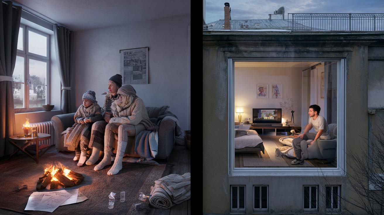 Im Wohnzimmer sitzt eine Familie mit Wollsocken, zwei Decken, drei Kerzen – und einer ausgeschalteten Heizung, als wäre es ein fremdes, gefährliches Gerät. Auf dem Couchtisch stapeln sich Stromrechnungen, daneben eine halbleere Tasse Tee, längst kalt geworden. Die Nachrichtensprecherin im Fernsehen spricht von Energiepreisen, von Verzicht, von Verantwortung. Irgendwer schnaubt genervt und dreht den Ton leiser.