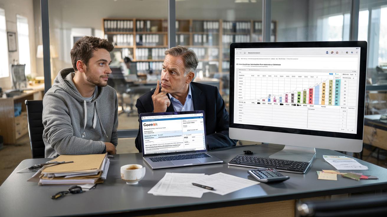 Der Steuerberater hebt eine Augenbraue. Auf dem Bildschirm blinkt eine Excel-Tabelle mit Prognosen, der Kaffee ist längst kalt geworden. Im Flur hört man gedämpfte Stimmen, irgendwo fällt eine Akte zu Boden. Der Gründer wirkt entspannt, fast siegessicher – als hätte er einen Trick gefunden, den das Finanzamt übersehen hat.