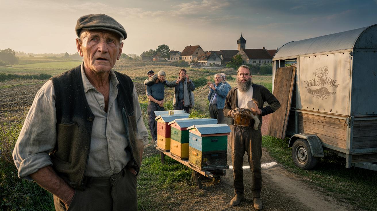 Am Feldrand steht ein alter Mann mit Schiebermütze, die Hände tief in den Taschen der ausgewaschenen Weste. Neben ihm summt es, als würde jemand ein leises Orchester stimmen: Reihen von bunten Bienenkästen, dahinter ein alter Hänger, auf dem „Honig aus dem Riedbachtal“ steht. Ein paar Meter weiter formt sich eine kleine Gruppe: der Bürgermeister, der Imker, zwei Nachbarn, die schon seit Jahren zerstritten sind und sich heute ausnahmsweise einig fühlen – gegen den Rentner.