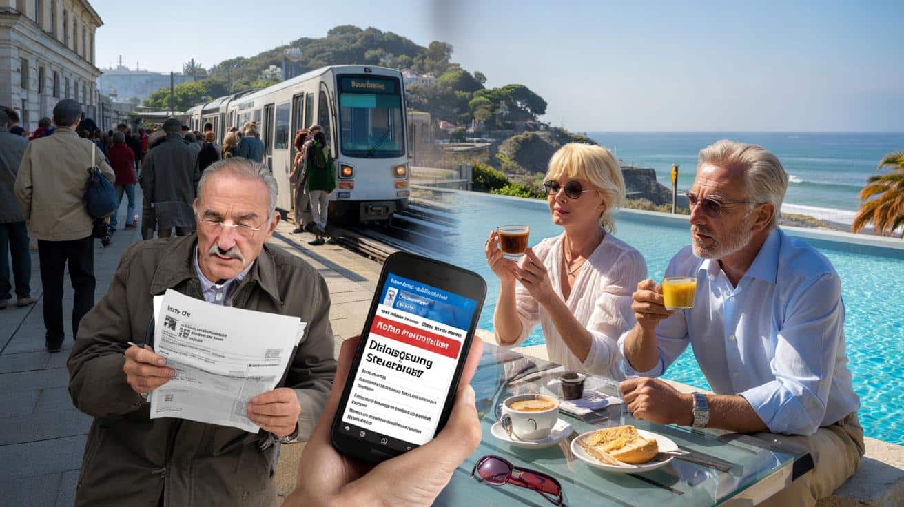 Der Mann im karierten Hemd sitzt am Rand eines Infinity-Pools und nippt an einem Cappuccino. Hinter ihm türkisblaues Meer, vor ihm das Smartphone mit deutscher Nachrichten-App. „Rentenkasse wieder in Milliardenminus“, liest er und lächelt nur müde. Sein Wohnsitz: Algarve, Portugal. Seine Rente: aus Deutschland. Seine Steuern: fast lächerlich gering. In der Ferienanlage nebenan parken SUVs mit deutschen Kennzeichen – viele davon gehören Menschen, die offiziell längst “weg” sind, aber von deutschem Geld leben.