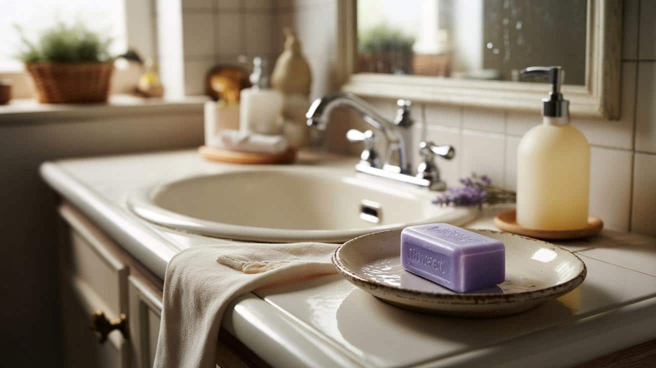 Der Trick deiner Oma ist brutal einfach. Du brauchst ein Stück hochwertige Lavendelseife, eine flache Schale oder ein Glas, lauwarmes Wasser und ein kleines Baumwolltuch. Lege die Seife in die Schale, gieße etwas Wasser dazu, gerade so viel, dass der Boden bedeckt ist. Dann nimmst du das Baumwolltuch, feuchtest es leicht in diesem Seifenwasser an und wischst damit Waschbeckenrand, Armaturen und die Innenseite der Badezimmertür ab. Keine Putzorgie, eher ein liebevolles Überstreichen. Der Clou: Das Seifenwasser bleibt in der Schale stehen und gibt langsam seinen Duft an den Raum ab.