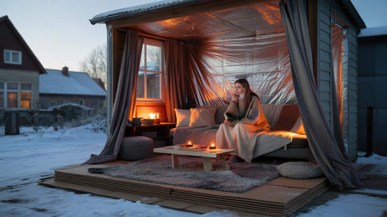 Der Kern der Methode: Du baust dir im wahrsten Sinne des Wortes eine warme Insel in deiner Wohnung. Nicht theoretisch, sondern ganz konkret. Ein Bereich, in dem du dich am meisten aufhältst – Sofa-Ecke, Homeoffice-Platz, Esstisch – bekommt eine „Thermo-Hülle“. Dicke Vorhänge oder Decken als Raumteiler, Teppiche mit Pappe oder Kork drunter gegen Boden-Kälte, reflektierende Rettungsdecke hinter dem Sitzplatz, um Körper- und Lampenwärme zurückzuwerfen. Plötzlich ist dein Wohnzimmer kein offener Kälte-Saal mehr, sondern ein kleiner Kokon. Die Temperatur kann messbar steigen, aber was noch stärker wirkt: Das subjektive Wärmegefühl explodiert.