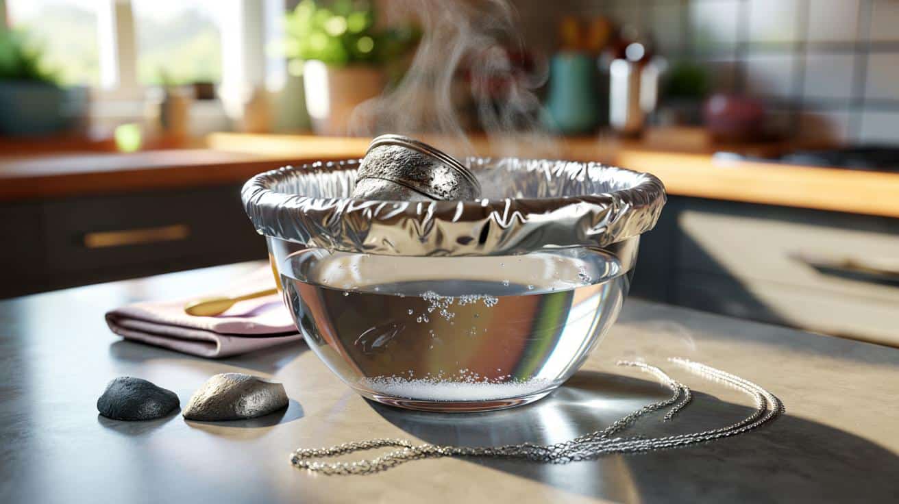 Zuerst kommt die Basis: Prüfen Sie, ob das Stück aus echtem Silber besteht und keine empfindlichen Steine oder Perlen enthält. Dann legen Sie eine kleine Schale mit Alufolie aus, glänzende Seite nach oben, und geben ein, zwei Teelöffel Salz hinein. Jetzt gießen Sie sehr heißes Leitungswasser dazu, bis die Folie bedeckt ist. Das Wasser muss nicht kochen, soll aber deutlich heiß sein. Legen Sie den Schmuck so hinein, dass er Kontakt mit der Folie hat. Nach wenigen Minuten bemerken Sie oft schon, wie sich die dunklen Stellen verändern.