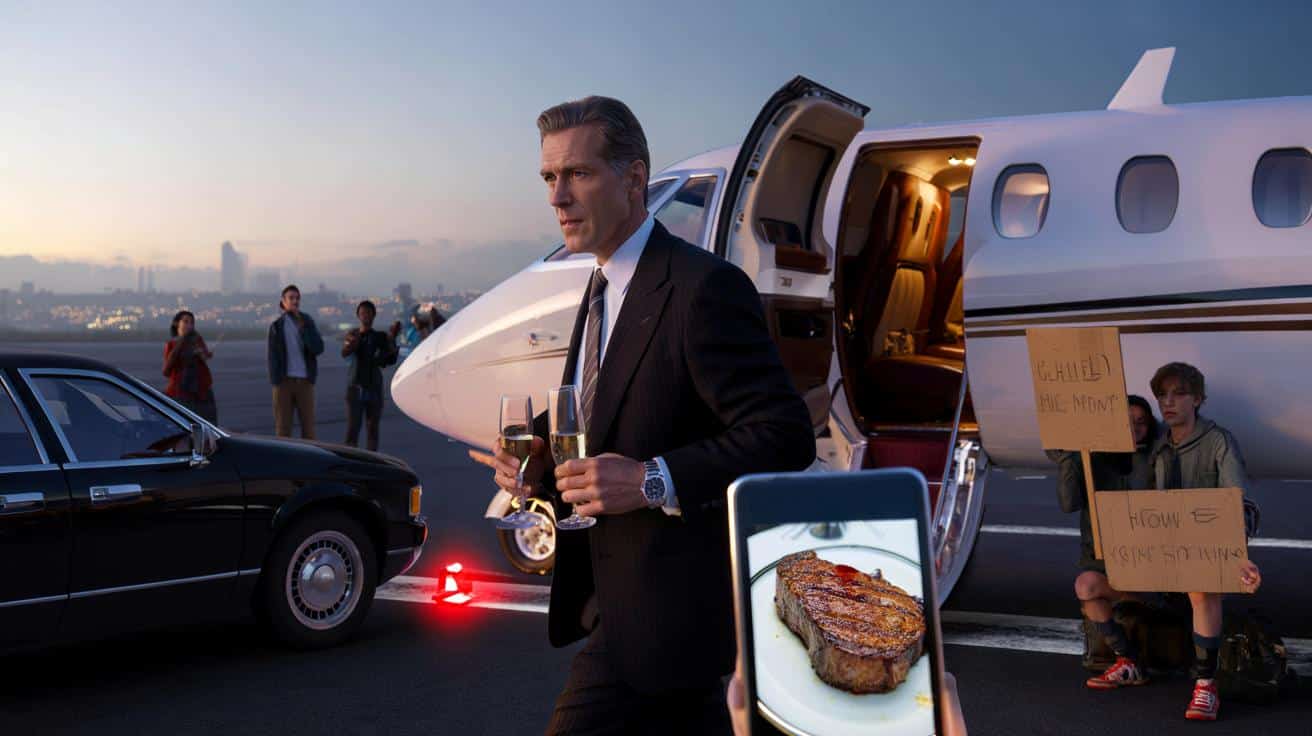 Im Terminal stehen ein paar Aktivistinnen mit Pappschildern, die niemand sehen soll. Der Sicherheitsdienst schiebt sie höflich, aber bestimmt zur Seite. Durch die Glasfront sieht man, wie der Jet in die Dunkelheit rollt. Eine Szene wie ein Meme, so überzogen, dass sie schon wieder echt wirkt. Und genau da beginnt unser Problem.