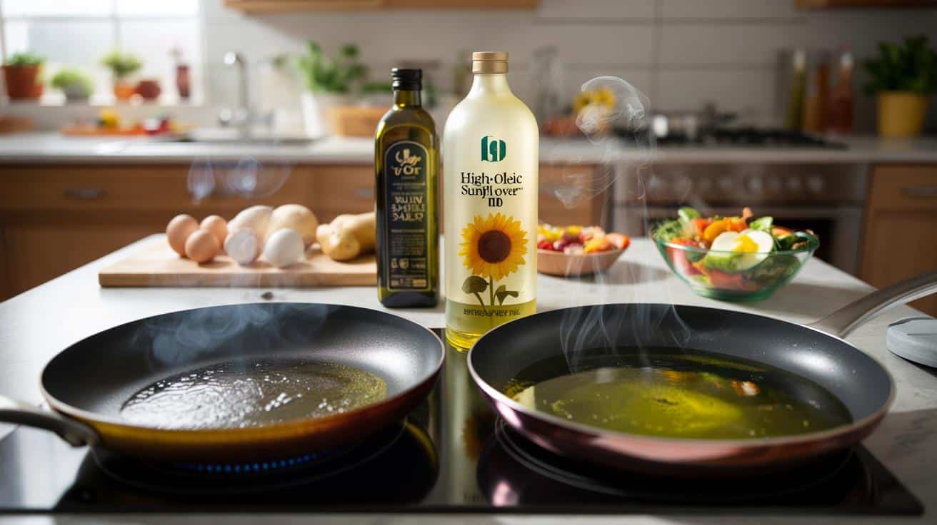 There’s one trap almost everyone falls into at first: grabbing “sunflower oil” without checking the label properly. The word “high-oleic” must be printed there, sometimes shortened to “HO”. No HO, no stability. Regular sunflower oil is high in linoleic acid, fine for short, gentle cooking but far from the heat champion we’re talking about.